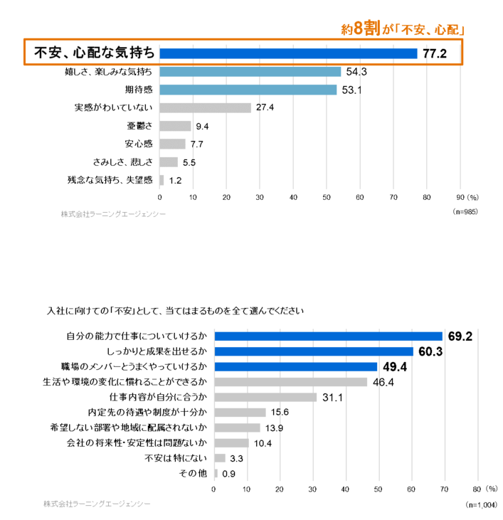 就職活動時から不安があるのはもとより、「就職先から内定はもらった」けれども再び入社に向け不安を感じていることが良く分かります。